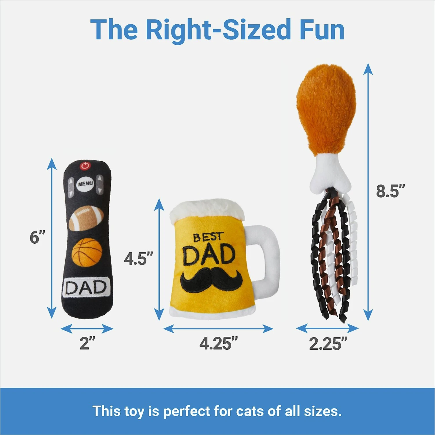 - Each plush toy has crinkle paper and is infused with catnip that’ll make your feline friend cheer right along with dad.