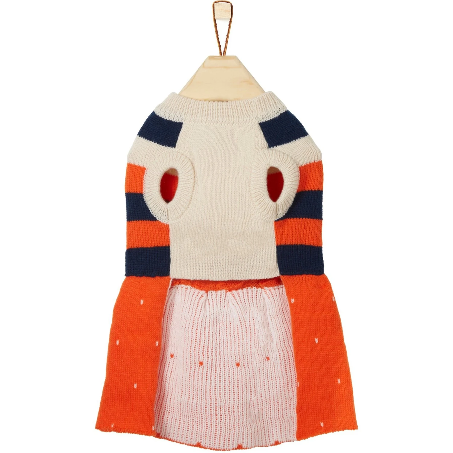 Give your pet the warmth of a sweater with the cuteness of a skirt! This sweater-dress combo is made with stretchy, sweater material on top and a flared skirt on bottom. This three-color, stripey design comes with adorable pom pom embellishments, and its pullover design makes it easy to put on. Plus, it makes your pet really pop during all your cold-weather fun, like fall gatherings, furry photo ops or just lounging around in cozy comfort.